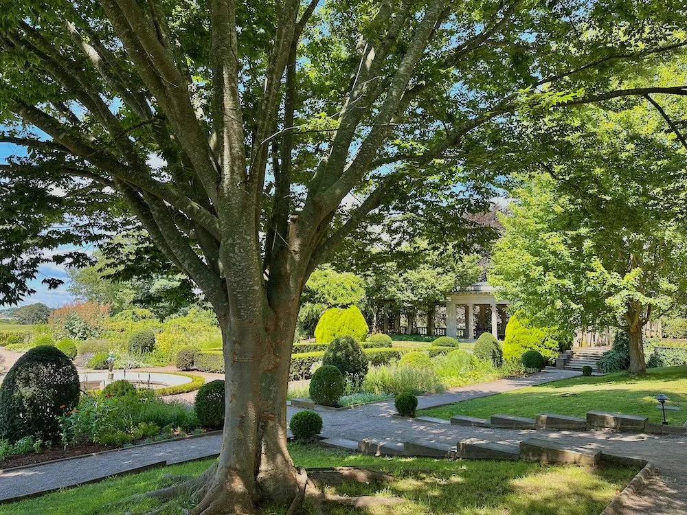 The Great Lawn, planted with specimen trees, connected the house to the new gardens. Immense weeping beeches partially concealed the fountains and pavilions, creating a sense of intrigue. An allee of topiaries was installed parallel to the sunken garden. A new garage, stable, and carriage house complex was designed to appear as a French chateau with its own terrace, arcade, fountain, and topiaries.