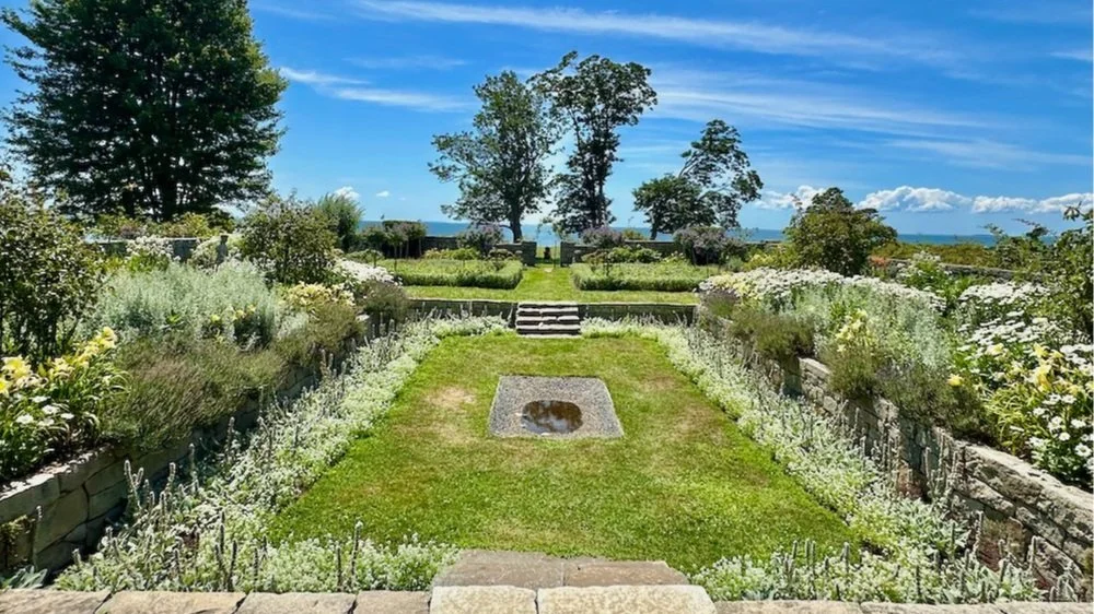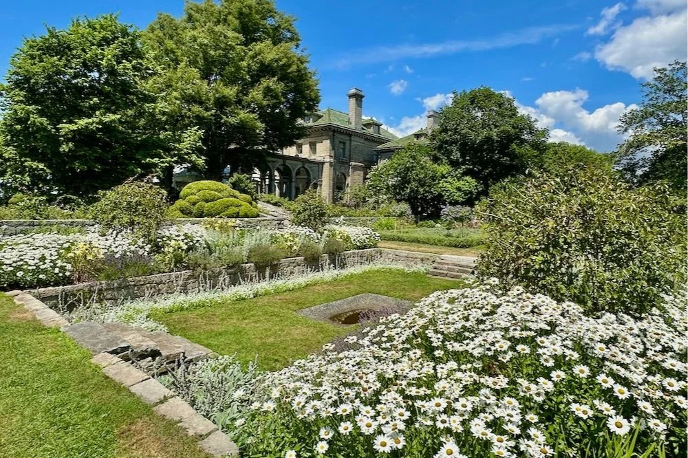 Stylish Americans adapted their country estates by adding gravel-lined forecourts, planted terracing, formal stairs and water features, herbaceous borders, and pergolas. Trumbauer reworked The Elms’ garden to reflect this new revival of classical Italian design. The pond became the present sunken garden at the back of the estate. Viewed from the terraces and summerhouses, the intricate patterning of annuals, ivy, yews, and euonymous is delightful.